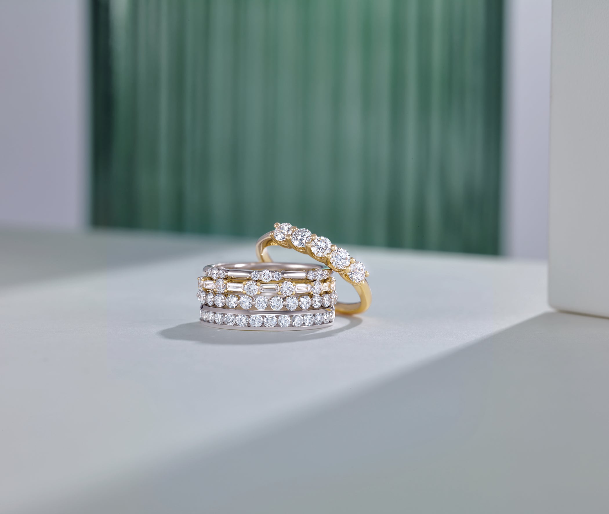 Complement your engagement ring with a band that shines just as brightly. Browse our exquisite collection of wedding bands, including both sparkling diamonds and colorful gemstones.